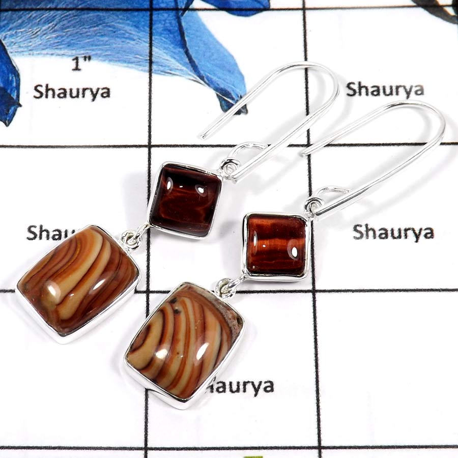 Solid 925 Sterling Silver Sandstone & Tiger Eye Gemstone Party Wear Earrings-SDE650..