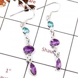Blue Topaz & Amethyst Cut O - BZE719-Beautiful Three Cut Stone Handmade Bezel Earrings 925 Ste