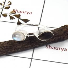 Smokey Cut & Rainbow Moonstone Cab A - STK942-Gorgeous Look Handmade Two Stone Stacking Ring 925 Sterling Silver