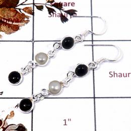 Black Onyx & Pearl j - BZE724-Exclusive Three Stone Wholesale Bezel Earrings 925 Sterli